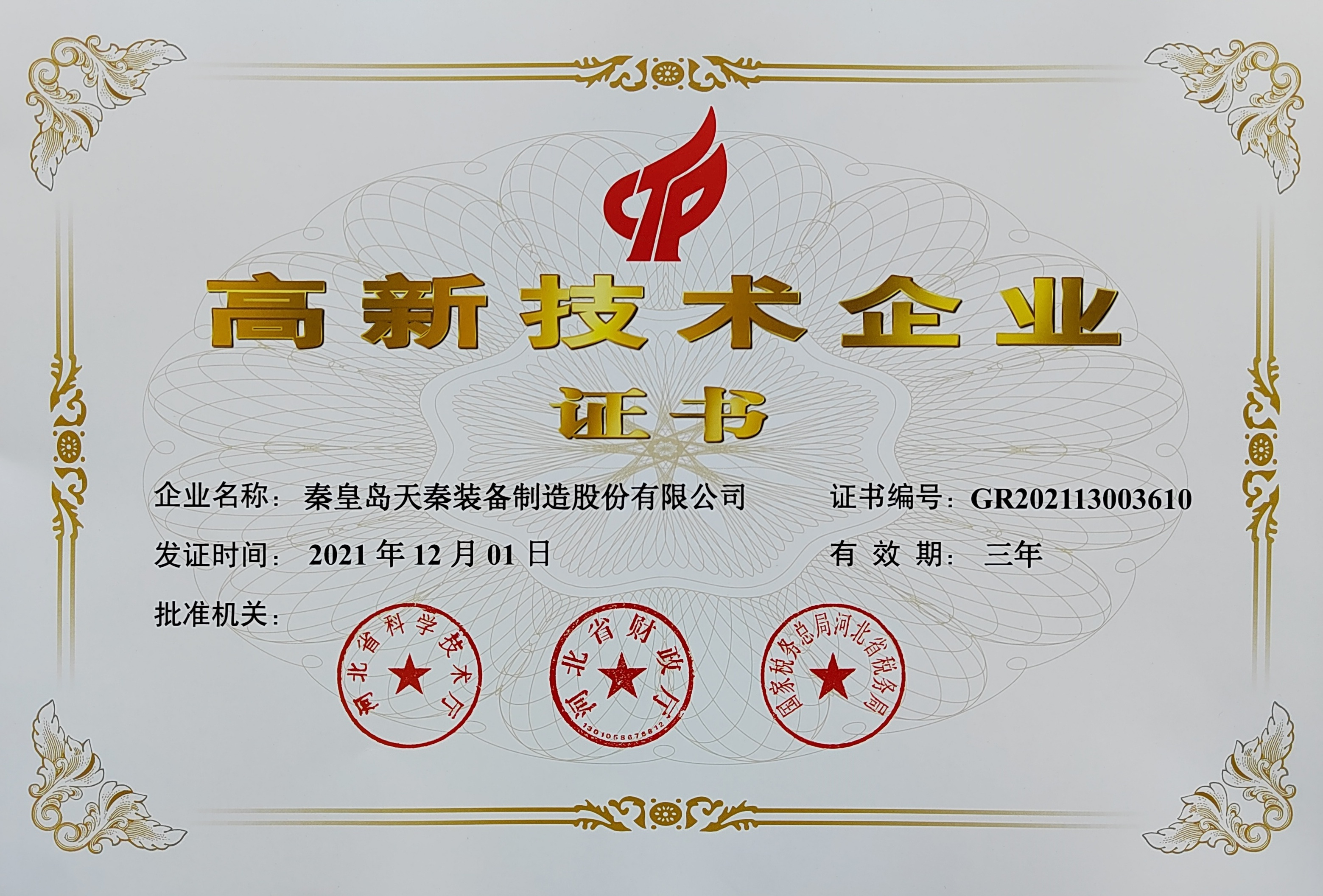 - 秦皇島天秦裝備制造股份有限公司創(chuàng)立于1996年,總部位于河北省秦皇島市經(jīng)濟(jì)技術(shù)開發(fā)區(qū),秦皇島廠區(qū)占地4萬平方米,擁有3萬平方米的標(biāo)準(zhǔn)廠房、辦公樓和工程技術(shù)研發(fā)中心;分部天津廠區(qū)位于天津市靜海經(jīng)濟(jì)開發(fā)區(qū),占地2萬平方米,擁有1.6萬平方米標(biāo)準(zhǔn)廠房。 公司通過了GB/T 19001質(zhì)量管理體系及GB/T 24001環(huán)境管理體系認(rèn)證,是國家高新技術(shù)企業(yè)、河北省軍民融合產(chǎn)學(xué)研用創(chuàng)建基地,建有省級(jí)院士工作站。